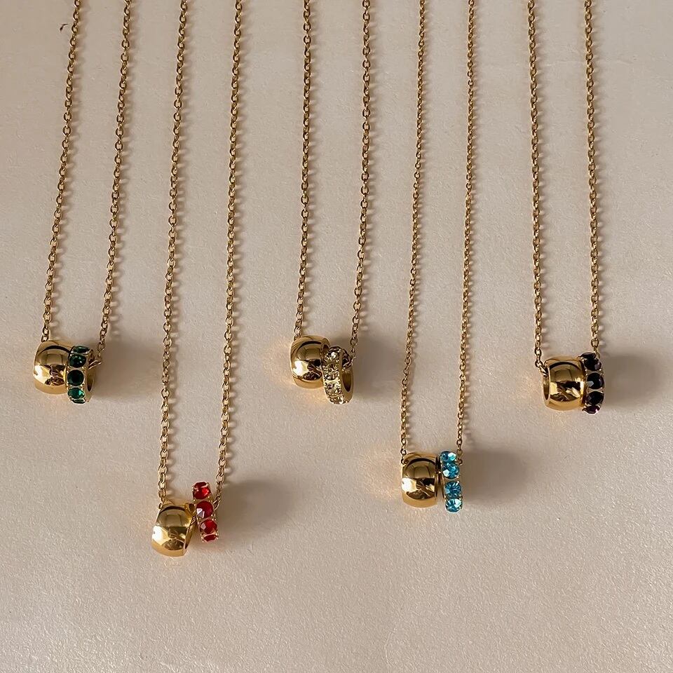 ゴールドリングとリング型に敷き詰められた誕生石カラーのクリスタルネックレスです。