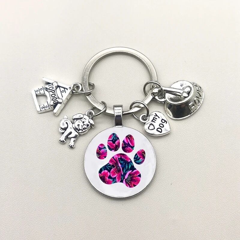 □★新品未使用品★わんちゃん肉球♪花柄2紫★チャーム☆キーリング♪キーホルダー☆シルバー★犬好き☆プレゼント◇送料無料◇