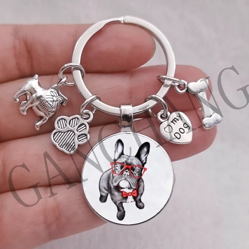 □★新品未使用品★ブルドッグ♪赤眼鏡★チャーム☆キーリング♪キーホルダー☆シルバー★犬好き☆プレゼント◇送料無料◇