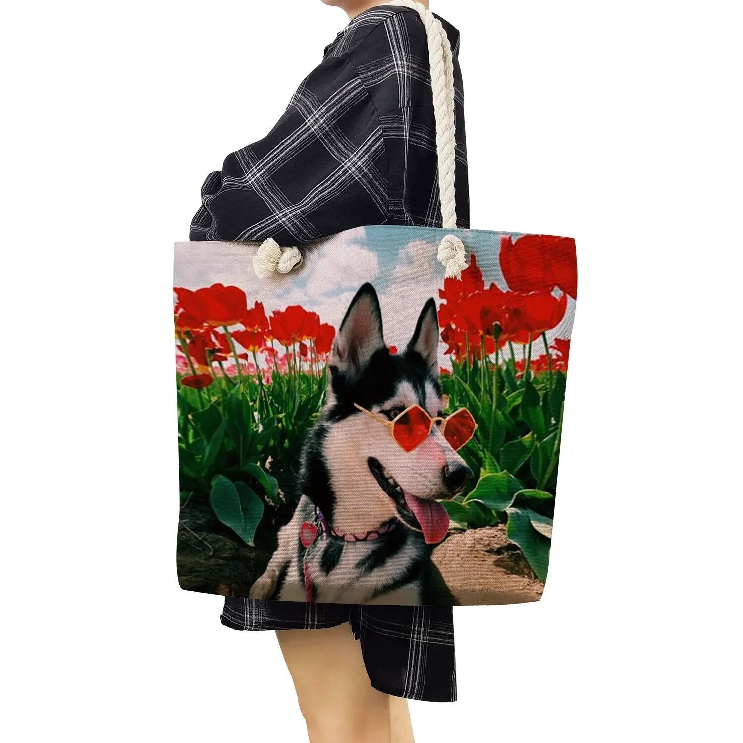 □シベリアン・ハスキー☆リネン♪トートバッグ★プリント♪ユニーク♪グラサン☆犬好き★大容量♪鞄☆45㎝★新品未使用品★送料無料◇