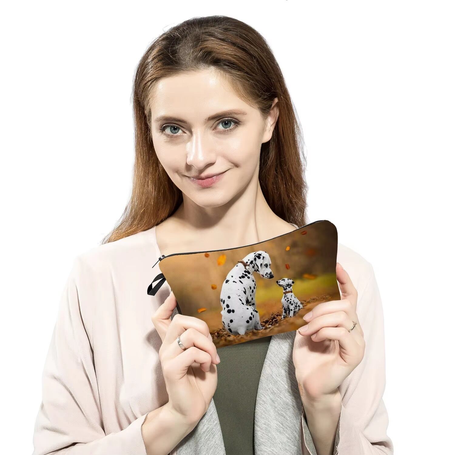 □ダルメシアン☆ポーチ♪小物入れ★プリント♪親子♪秋☆犬好き★化粧バッグ☆チャック★新品未使用品★送料無料◇